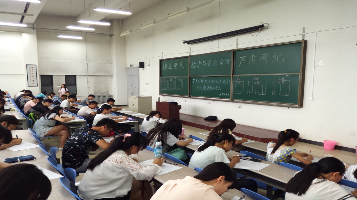 (通讯员:遇萱)经过一周紧张充实课程的学习,新一批大学生入党积极分子于2015年5月17日在B楼537进行中级党课结业考试。此次党课课程及结业考试由经管院团委组织部主办,在部长王雅彤的组织带领和各干事的共同合作下,经管院第十五期大学生业余党校中党课程取得圆满成功。十五期中级党课主要分三讲:樊稳老师的《理想与信念》、王益锋老师的《保持党员先进性》以及刘文博老师的《关于入党与党的基本理论》。党课主题深刻、内容丰富,都给各入党积极分子留下了深刻印象。在此次的中党结业考试中,各成员都怀着无比激动的心情,严肃对待考试过程。在考试的一小时过程中,新一批入党积极分子都认真严谨地完成考试内容,争取向党组织递上一份满意的答卷!