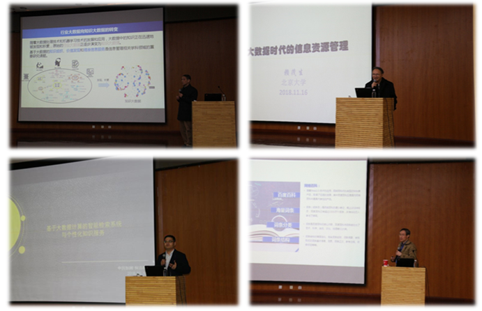 大会主题报告分为上午和下午两阶段。在上午的议程中,武汉大学人文社会科学资深教授、国家教学名师、教育部人文社会科学重点研究基地武汉大学信息资源研究中心首席科学家、武汉大学大数据研究院院长马费成教授做了题为“大数据环境下用户需求信息组织”的报告;北京大学信息管理系教授,国家信息资源管理北京研究基地主任赖茂生教授做了题为“大数据时代的信息资源管理”的报告;同方知网(北京)技术有限公司总经理助理柯春晓做了题为“基于大数据计算的智能检索和个性化服务”的报告;南京大学信息管理学院教授、教育部长江学者特聘教授朱庆华做了题为“基于多维度视角的百度百科词条分类及评价研究”的报告。