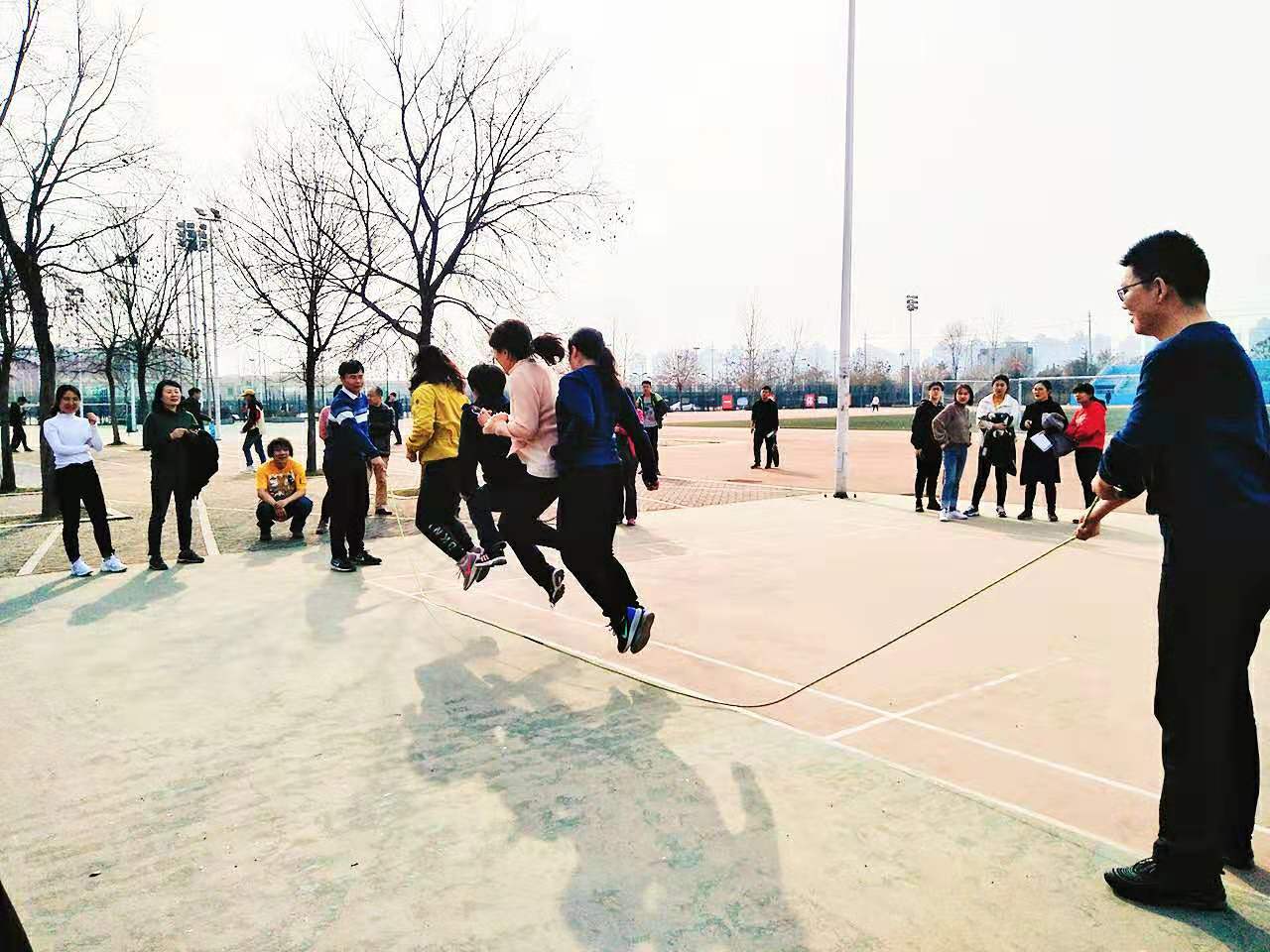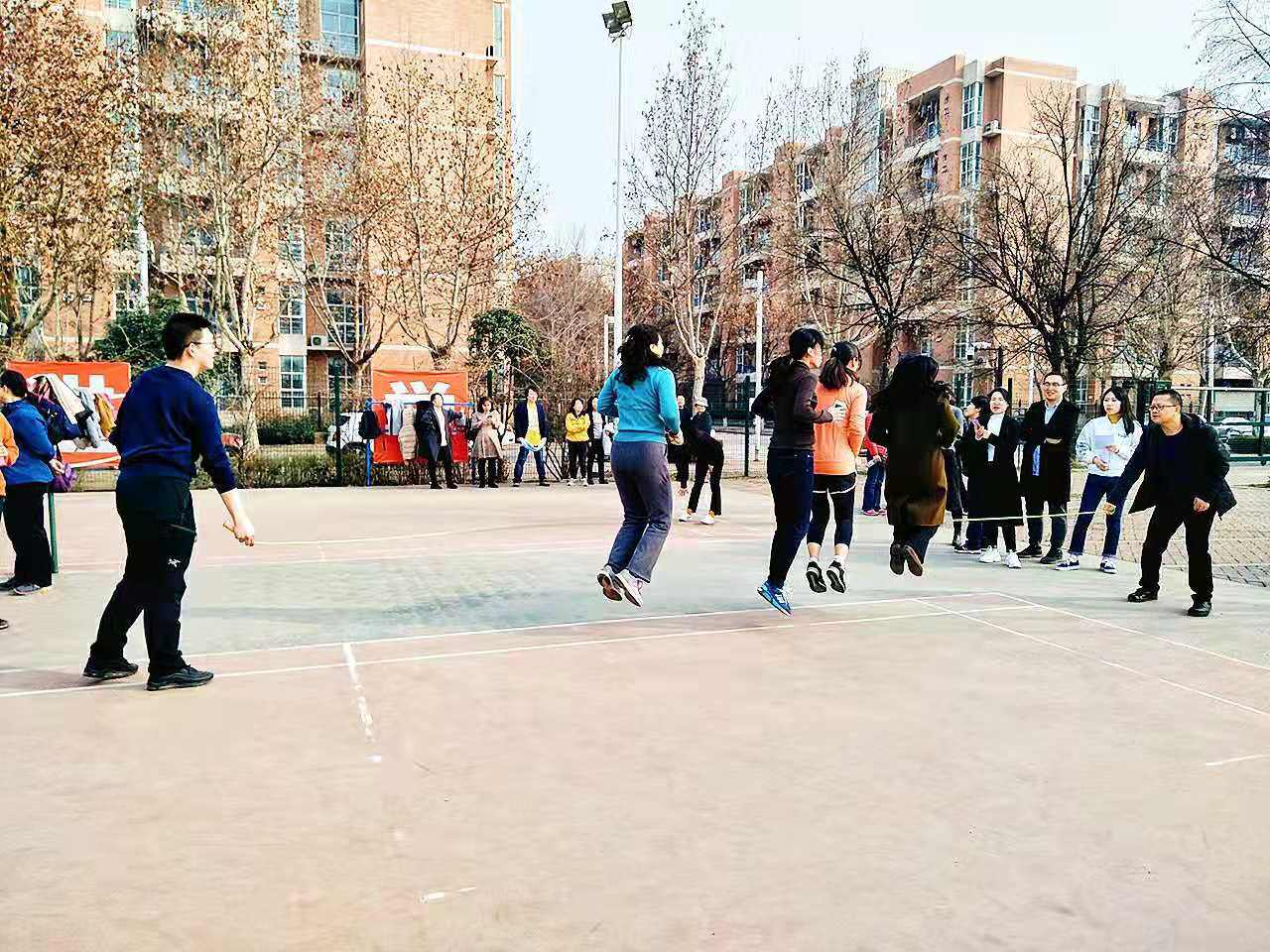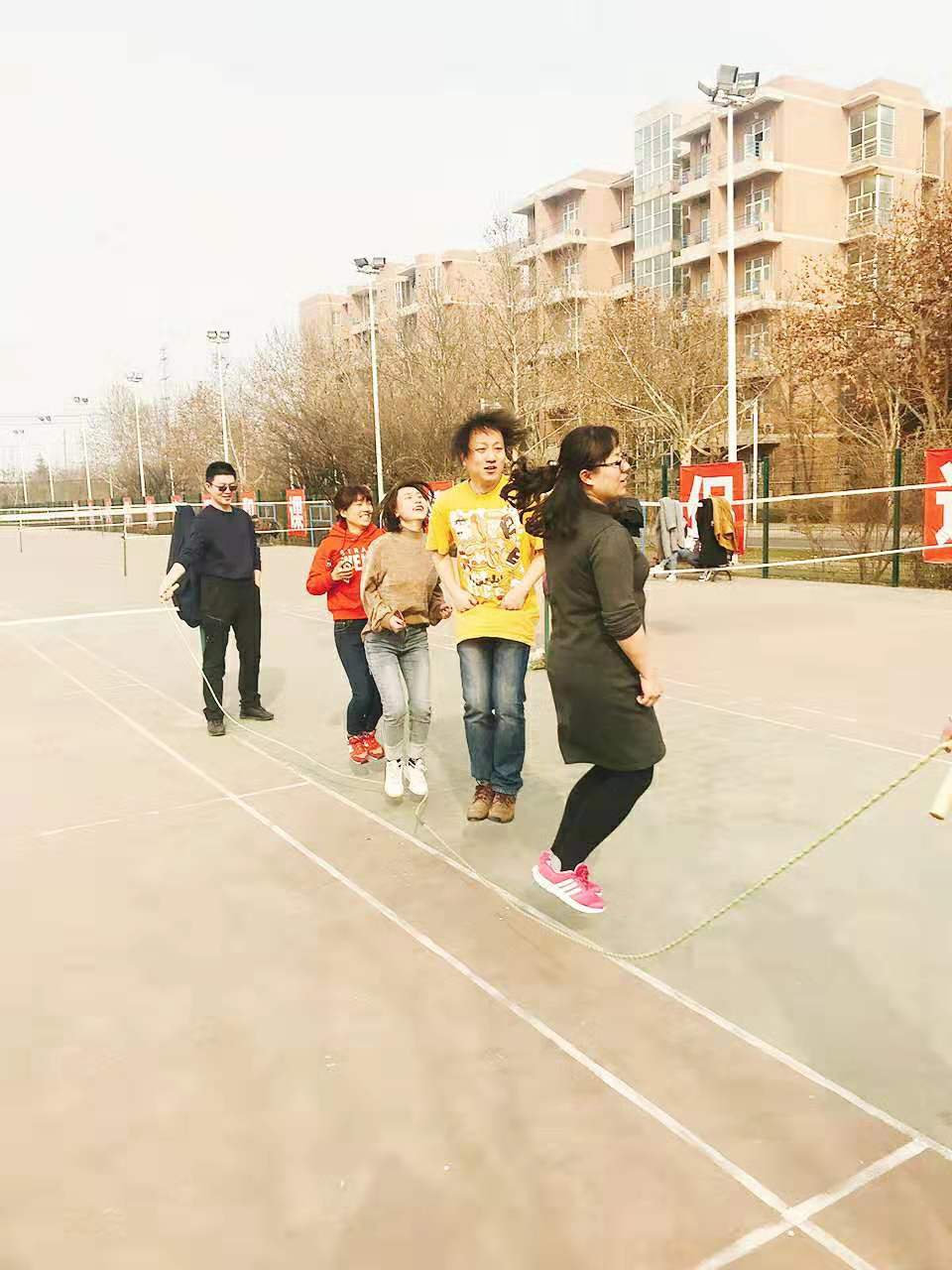 仔细一看,参加比赛的不是学生,而是学院的教师们。组织这次比赛,是为学院女教师庆祝马上要到来的3.8妇女节,让平常在一线工作的老师们放松一下,都能展现自己的魅力。别看老师们平时上课的时候端庄严谨,跳大绳的时候课时活力满满呢。来参赛的由学院机关和各个系的多名老师,大家自行分为几个小组,规则是每个小组至少4人上场比赛,在三分钟内跳的次数最多的小组获胜。