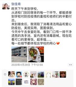 学院第一批返校学生张佳希返校后,在朋友圈这样写道:“昨天下午来到学校,从进校门到回宿舍的每一个环节,都能感受到学校对防控疫情的重视和老师们的辛勤付出。来到宿舍后,我领取了消毒清洁用品和爱心防疫包,美观实用,面面俱到。今天中午去食堂吃饭,看到门口有一排干净透亮的洗手池,室内还有消毒器械。现在吃着可口的里脊饭,超幸福……每一处细节都体现出学校的用心”。