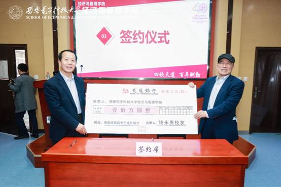 会上举行了钱永贵校友奖学金颁奖仪式。钱永贵为获奖学生代表颁发证书。2017级行政管理专业王馨锋发言,感谢钱永贵学长的资助,使其在学习和生活的过程中感受着西电校友的殷殷祝福,感受着西电经管院大家庭的温暖,立志以校友为榜样成长成才回馈母校。十年轮回,钱永贵再次向学院捐赠100万元作为留本基金长久资助经管院学子,助力他们实现梦想。