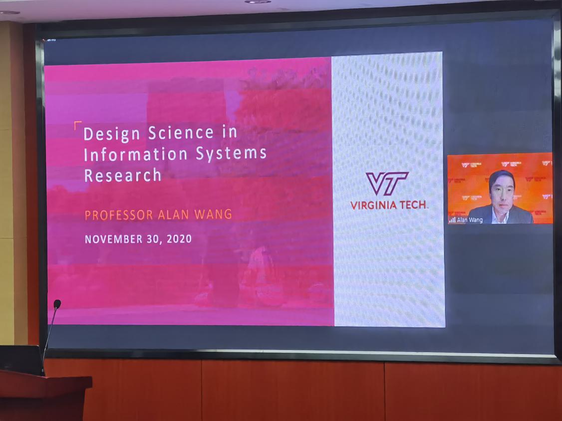 (通讯员:刘婧阳 罗鸣 马元凯)11月30日上午,现任职于弗吉尼亚理工大学潘普林商学院的Alan Wang教授,通过zoom平台视频会议在皇冠正规娱乐平台南校区信远324报告厅作了题为“Design science in information system research(信息系统研究中的设计科学)”的学术报告,线上线下共120余名师生参加报告会,会议由学院副教授艾时钟主持。